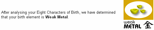 Based on the complex analysis of the Ba Zi Feng Shui using the Year, Month, Day, and Hour of Birth to determine your personal element.